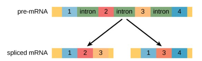 Alternative RNA splicing is a common mechanism of gene regulation in eukaryotes. Up to $70\%$ of genes in humans are expressed as multiple proteins through it. Different combinations of introns and exons made up per-mRNA. And introns or exons to be removed from the primary transcript. Spliced mRNAs will create different proteins.
