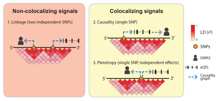 Colocalization is that GWAS, eQTL signal are overlaped on the same locus. It can determine whether the SNP in GWAS affect gene expression. There are three conditions