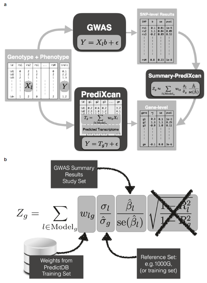 GWAS identifies SNPs that affect a trait, but the mechanism is unknown. We use S-PrediXcan to determine whether SNPs affect the trait through gene expression.