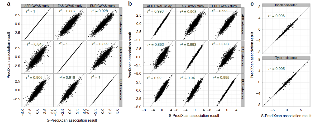 For the same race, S-PrediXcan and PrediXcan are high correlated. Eventhough different race, it is high correlated also. Futhermore, for AFR sutudy/refernce set, the EUR $r^2$ is higher than EAS.