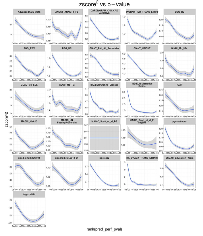 $$ \begin{align*} Z_g = & \sum_{l \in \text{Model}_g}^{} w_{lg} \ \frac{\sigma_l}{\hat{\sigma}_g} \ \frac{\hat{\beta}_l}{se(\hat{\beta}_l)} {\sqrt{\dfrac{1-\mathit{R}_l^2}{1-\mathit{R}_g^2}}} \\ \approx & \sum_{l \in \text{Model}_g}^{} w_{lg} \ \frac{\sigma_l}{\hat{\sigma}_g} \ \frac{\hat{\beta}_l}{se(\hat{\beta}_l)} \end{align*} $$- make sure that the GWAS and prediction model are based on the same population.