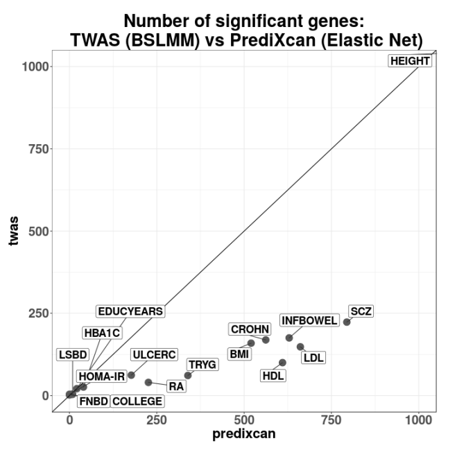 - difference between S-TWAS, S-PrediXcan is prediction models. TWAS uses BSLMM whereas PrediXcan uses elastic net